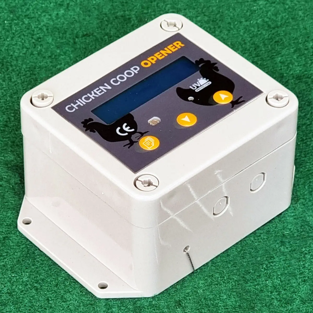 Installation is quick and intuitive, suitable for our chicken coops or other shelters. The control unit can lift alternative doors weighing between 300 and 1000 grams. Powered by 4 AA batteries (not included), the system is weatherproof, rainproof, and UV resistant. Made with high-quality materials, it ensures long-term durability.