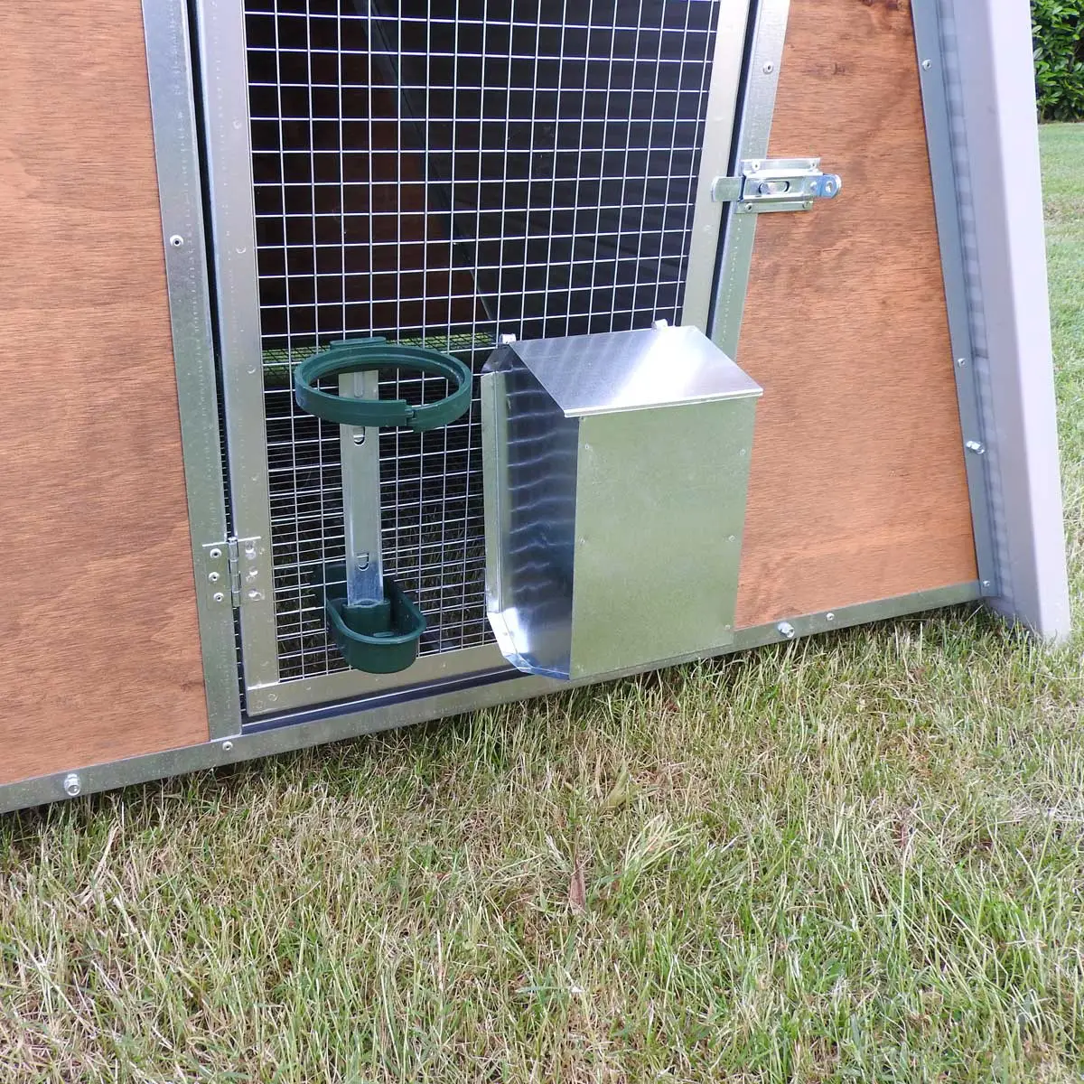 - Equipped with a feeder and drinker to supply food and water to the animals