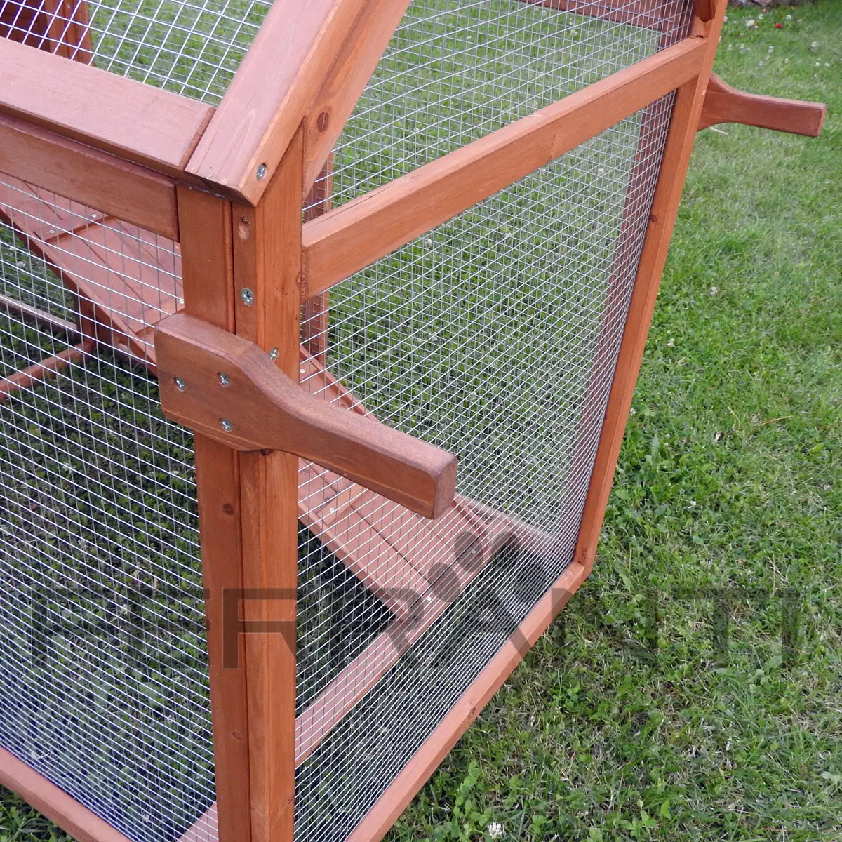 - mobile chicken coop in wood, equipped with wheels and front handles for easy movement