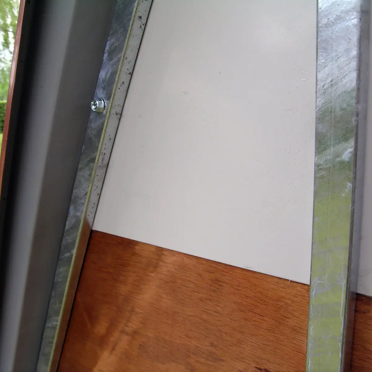- materiali: struttura in acciaio zincato, tetto in lamiera grecata, pannello posteriore in legno multistrato marino trattato e frontale in rete metallica da 25 x 25 mm e maglia 2 mm