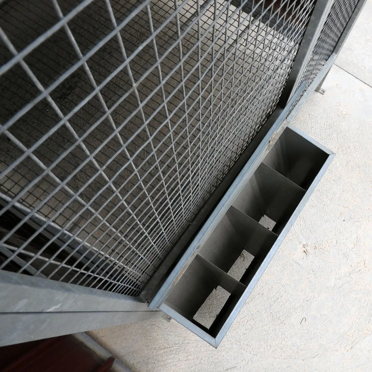 - Fondo: rete calpestabile con maglia 3 x 3 cm, per comfort e facilità di pulizia